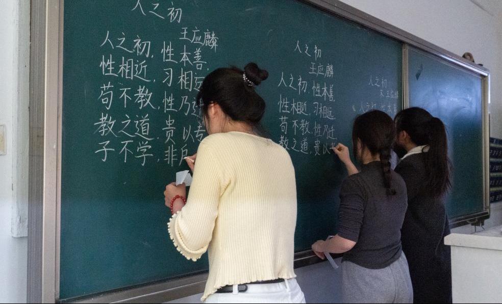 比赛现场,选手们全神贯注地投入创作。粉笔字环节,参赛者随机抽取教育家经典论述进行书写,限时20分钟;