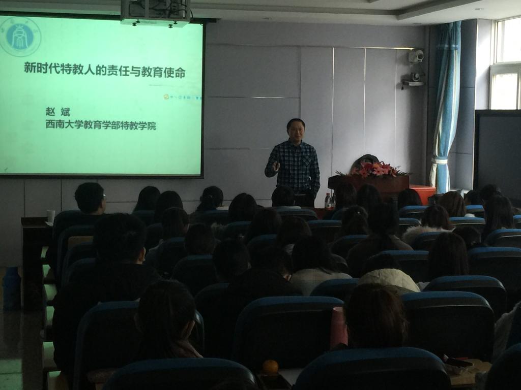 2018年11月27日下午,教育部高等公司特殊教育教师培养教学指导委员会委员、西南大学特殊304永利集团登录入口经理赵斌教授莅临公司,开展主题为“新时代特教人的责任与使命”的专题讲座,讲座由特殊教育教研室主任隋春玲老师主持,特教专业120位师生聆听了此次讲座。