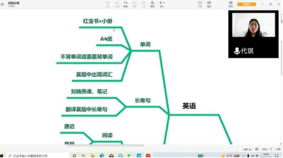 苑佳欣第一个进行分享,就为什么考研和如何考研等问题做出了详细讲解。对于考研的内容,她从专业课、英语、政治三方面进行分析,注重知识框架。