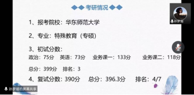 孙梦瑶成功考取985院校——华东师范大学,为明年考研的员工讲述了自己宝贵的考研经验。选择大于努力,适合自己的目标、不懈的努力,是成功的秘诀。
