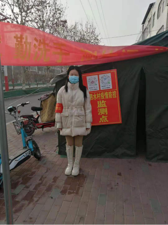 王真同学,在河北疫情爆发后,作为一名邢台人,她在做好自身防护,遵守村庄防疫的同时,积极响应国家的号召。在看到村庄招募疫情志愿者的通知后,以第一时间赶到村委会报名参加。并说" 我是一名大四员工,我想要在社会需要的时候,做一些力所能及的事情,为疫情防控贡献一份自己力量"。她和社区工作人员一起对进出人员车辆进行登记,并帮助进行整理资料和数据汇总。