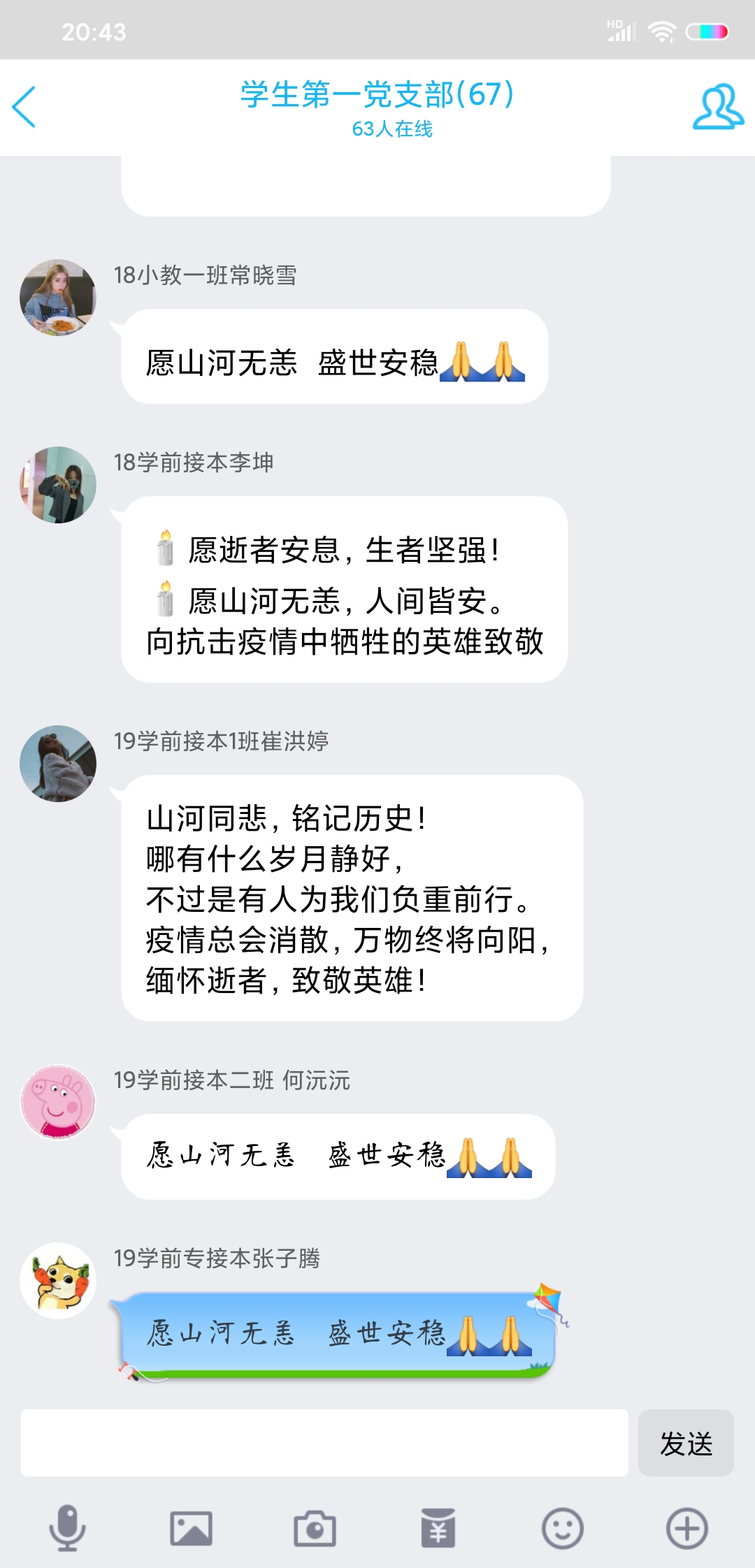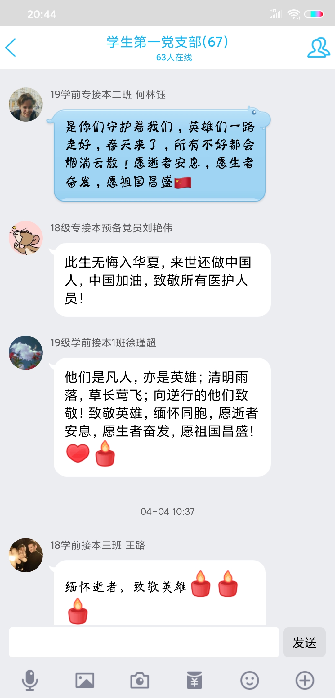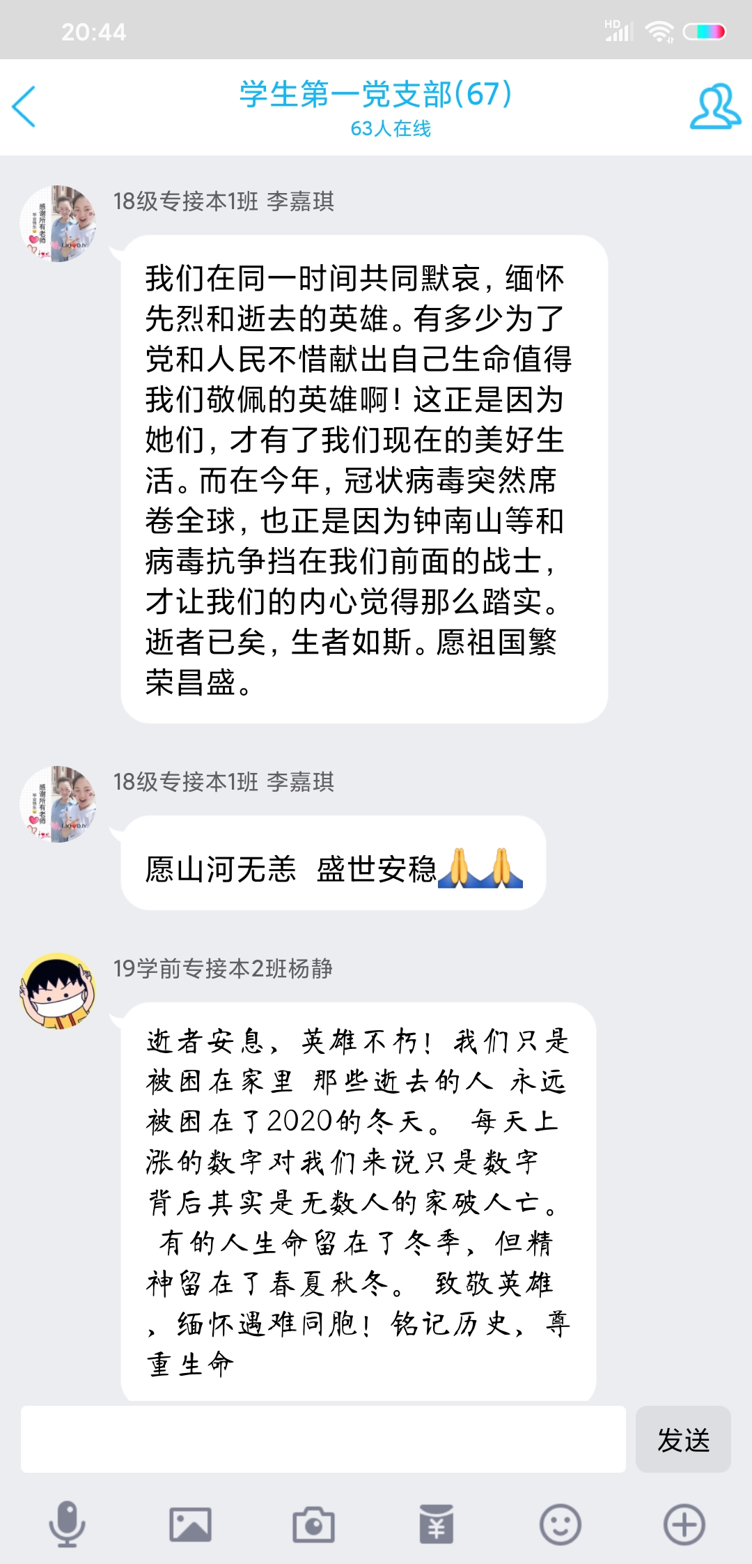 上午十点整,全体党员集体在家中默哀。默哀完毕后,员工第一党支部书记率先在群内留言致敬抗英英雄,缅怀同胞。全体员工党员纷纷表达了对在抗击疫情中逝去的同胞,最崇高的敬意和最深切的哀悼。