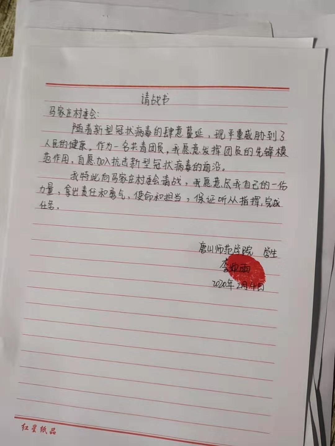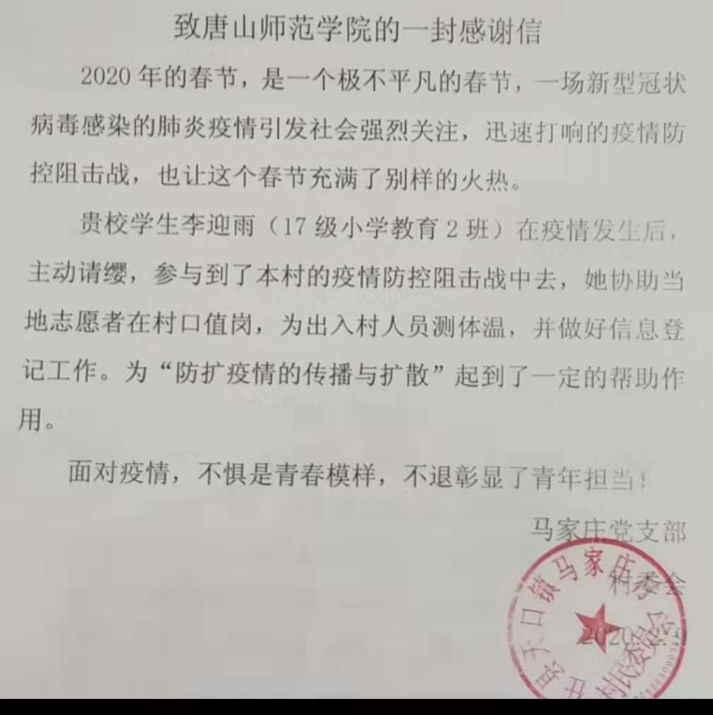 2020年2月11日,304永利集团登录入口收到了一封来自马家庄党支部的感谢信,对17级小学教育2班李迎雨同学在协助村委抗疫工作中的表现予以肯定和赞扬。