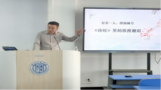 讲解活动中,王凯先生首先阐述了《诗经》在我国文学史上的崇高地位及其深远的文化意义,强调《诗经》作为中国古代诗歌的源头,承载了中华民族丰富的人生哲理和道德价值,是我们宝贵的文化遗产。随后,他深入解读了《诗经》的艺术特色,通过对具体诗作《氓》的分析,揭示了古代女性在婚姻中的地位与命运,激发了在场师生的深刻思考。此外,王凯先生还以《伐檀》《硕鼠》等诗篇为例,展示了古代劳动人民对剥削阶级的不满与抗争,彰显了他们的勇气与智慧。在讲述过程中,王凯先生以生动的语言展现了《诗经》的独特魅力。