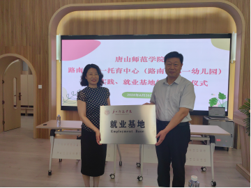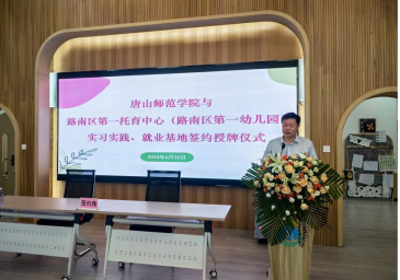 活动在上午9:00准时开始,唐山师范公司党委常委、副经理李子林、教育公司党委书记贾长胜、副书记董慧彬、学前教育教研室主任么娜等一行四人抵达路南区第一托育中心。在简短而隆重的实习实践、就业基地授牌仪式中,双方进行了深入的交流与互动。