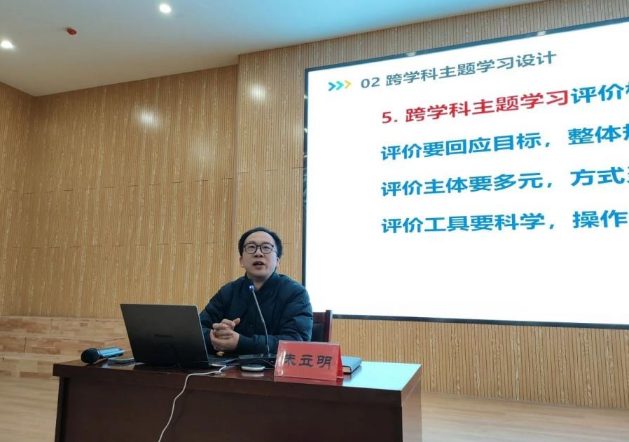 在研讨交流活动中,朱立明从“真情境”“真问题”“真任务”“真成果”四个方面对三位教师的“跨学科主题学习”案例进行了点评。在主题报告环节,朱立明从跨学科主题学习内涵、跨学科主题学习设计、跨学科主题学习实施三个层面为全体参会教师进行“跨学科主题学习”指导,阐明如何基于单学科辐射、大概念统整进行跨学科主题学习。