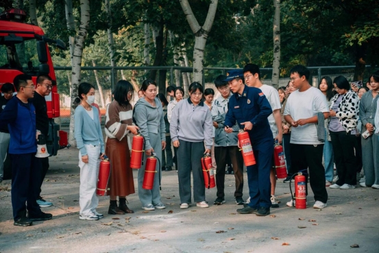 在篮球场上,由西山道消防救援中队刘队长给员工们演示了如何使用灭火器,并安排了现场体验环节,老师和同学们纷纷上前参与,在消防队员的指导下,拔栓、摇晃、按压,掌握了灭火器的使用要领,现场氛围特别活跃。