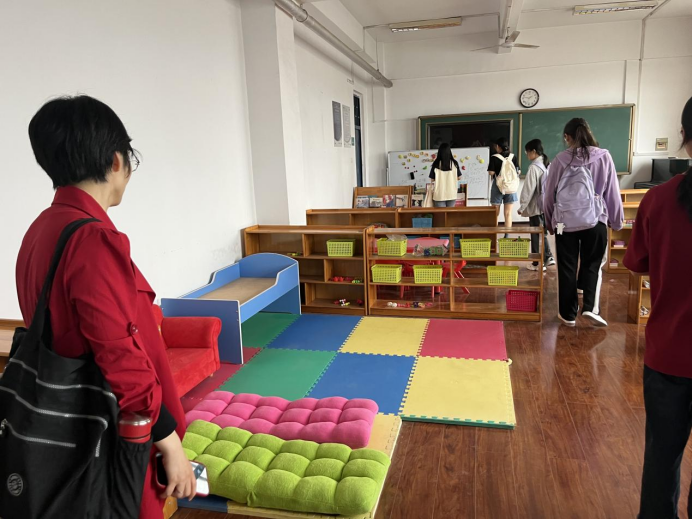 活动一开始,许多学前教育专业的员工闻讯前来参观,其中不乏其他专业的员工一同观摩。同学们被实验室中多种多样、精巧可爱的玩教具所吸引。为了让大家对各种器材、设备有更深入的了解,公司还聘请学前教育教研室主任么娜老师进行讲解说明。
