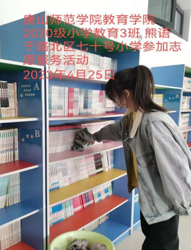 开展志愿活动的形式是多种多样的。图书馆作为人们汲取精神养料,丰富自身内涵的知识殿堂,应仔仔细细排好每一本书,做好图书的清洁工作,为读者提供一个干净,舒适的阅读环境。我们的志愿者在整理图书工作中深切体会到了图书管理人员的艰辛,既要对阅览室进行日常的管理还要协助图书馆负责人进行书刊整理、新书注册、分类排序、上架、理架等工作。虽然辛苦,但是也锻炼了自己的能力。
