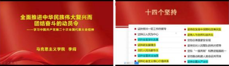 李阎老师为马克思主义公司副教授、法学博士,马克思主义公司“概论”教研室主任,中国李大钊研究会、唐山市历史学会、唐山市红色文化研究会会员。本次宣讲主题为“全面推进中华民族伟大复兴而团结奋斗的动员令”,李阎老师对党的二十大报告的形成、党的二十大召开的重大意义、会议的主题、过去五年工作和新时代十年伟大变革、以中国式现代化全面推进中华民族伟大复兴的使命任务、未来五年党和国家各项事业发展的战略部署、以伟大自我革命引领伟大社会革命等方面进行讲解;尤其结合了思政课教师的专业和教学经历,对习近平新时代中国特色社会主义思想的世界观和方法论进行了深入解读和观点分享。