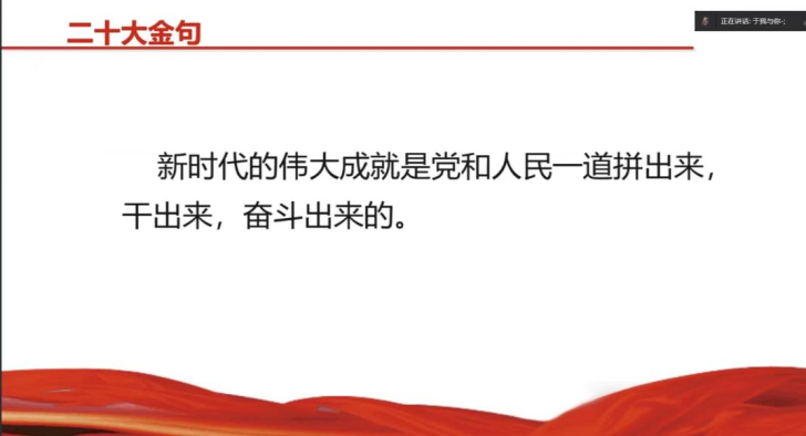 第一部分是对二十大金句的学习。中国共产党第二十次全国代表大会,是在全党全国各族人民迈向全面建设社会主义现代化国家新征程,向第二个百年奋斗目标进军的关键时刻召开的一次十分重要的大会。于浩同志提出,在实现中华民族伟大复兴目标的过程中,越是遭遇美国一些西方国家对我们国家的打压,越是处在这样一个紧要关头,就越需要我们党员干部在主观上有良好的精神状态。不仅是对外,在疫情期间,我们的医护工作者挺身而出,持续奋斗在抗击病毒的一线;还有货车司机、快递小哥等,不辞辛劳,连续奔波在配送物资的路上;社区人员、志愿者也积极落实防疫政策,维持生活秩序,保护公共安全。三年来,我们的祖国尽最大程度地保护了我们的安全,靠的就是党和人民,正是亿万人民心往一处想、劲儿往一处使,才使得我们一次又一次克服了疫情。所以每一个年轻党员同志、每一个积极分子,都要发挥先锋模范作用,增强党性觉悟,牢记宗旨使命,遵守规章制度,不断提升自己。