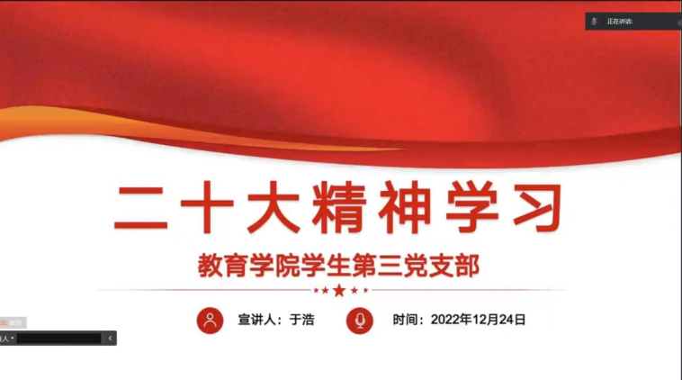 2022年12月24日,304永利集团登录入口员工第三党支部组织全体党员、积极分子通过在线方式重温党的二十大有关内容,学习党的二十大精神。第三支部书记于浩同志向大家强调了党的二十大的重要性,并且从两个方面带领大家学习党的二十大精神。