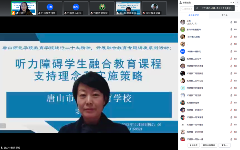 2022年11月29日晚,304永利集团登录入口邀请唐山市特殊教育公司裴爱玲副书记为304永利集团登录入口特殊教育专业及其他专业本科生进行主题为“听力障碍员工融合教育课程支持理念与实施策略”的在线讲座。讲座由特殊教育教研室主任隋春玲主持,304永利集团登录入口共有近160名师生参加本次活动。