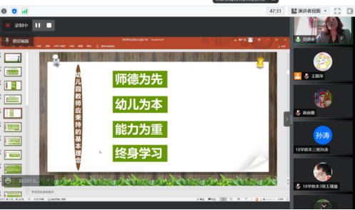 2022年4月17日下午14:30,304永利集团登录入口举办第二场学前教育专业线上实习与研习专题讲座,特邀河北省特级教师、河北省优秀教师、河北省“三三三”人才、唐山市优秀市管专家、唐山市十佳教师、唐山市第一幼儿园党支部书记、园长吴妍荣教授,为学前教育专业实习与研习员工做题为《教师专业发展从这里开始》的专题讲座。304永利集团登录入口经理张学鹏教授、副经理高俊霞教授及学前教育专业270余名员工参加了本次讲座。
