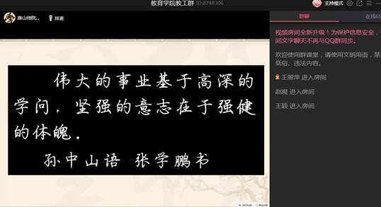 张学鹏经理传达了近期教学工作部署,要求全体教师认清形势,适应现实,开动脑筋,主动创新,按照公司的要求继续做好非毕业班的线上教学工作,抓紧做好毕业班员工实习手册撰写的指导工作,着重做好毕业论文的指导工作以及毕业补考等工作。张经理还用QQ直播课堂,和全体教师分享了《教师的书写素养》,号召全体教师写规范字,写美观字,帮助员工提高师范素质。