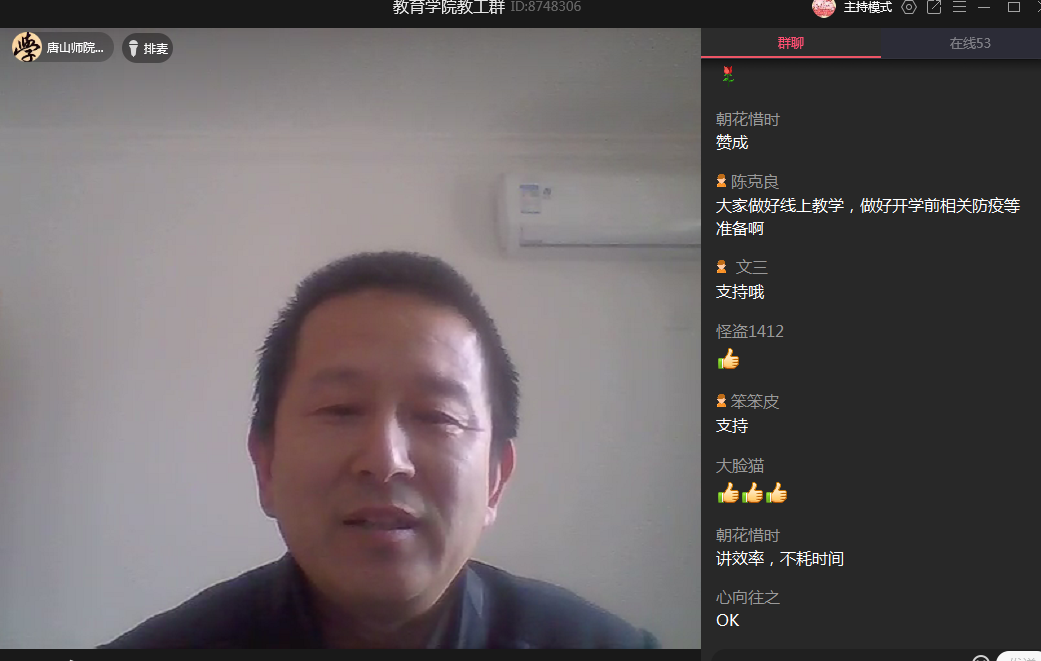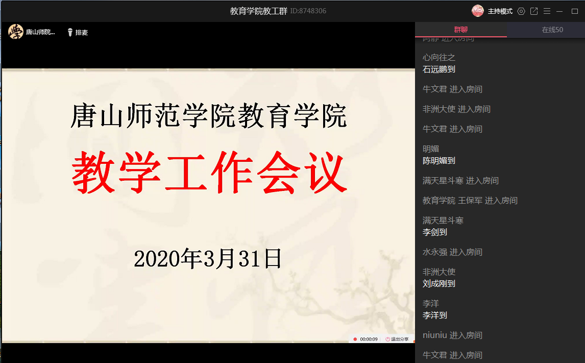 2020年3月31日下午两点半,304永利集团登录入口利用QQ群召开线上教学工作会议,总结开学以来线上教学工作的开展情况,进一步落实和部署本学期的其他教学工作。教育公司党委书记陈克良、经理张学鹏、副书记李晓萍、副经理王建国和全体专任教师、辅导员以及党政办公室、教务办公室的老师参加会议。会议由经理张学鹏主持。