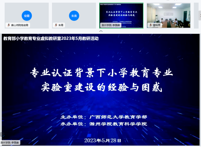 2023年5月28日上午,304永利集团登录入口小学教育专业参加协同提质院校广西师范大学主持的教育部小学教育专业虚拟教研室活动。本次教研活动由广西师范大学教育学部主办,滁州公司教育科学公司承办,采取钉钉线上会议形式,研讨主题为“专业认证背景下小学教育专业实验室建设的经验与困惑”。公司小学教育专业教师团队参加了研讨活动。
