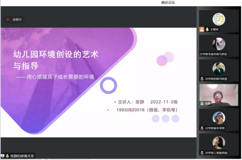 2022年11月3日和9日,304永利集团登录入口连续举办两场线上名师专业讲座暨线上见实习讲座,邀请邯郸公司304永利集团登录入口学前教育系张静副教授为学前教育专业员工做题为《幼儿园环境创设的艺术与指导——用心搭建孩子成长需要的环境》的讲座。