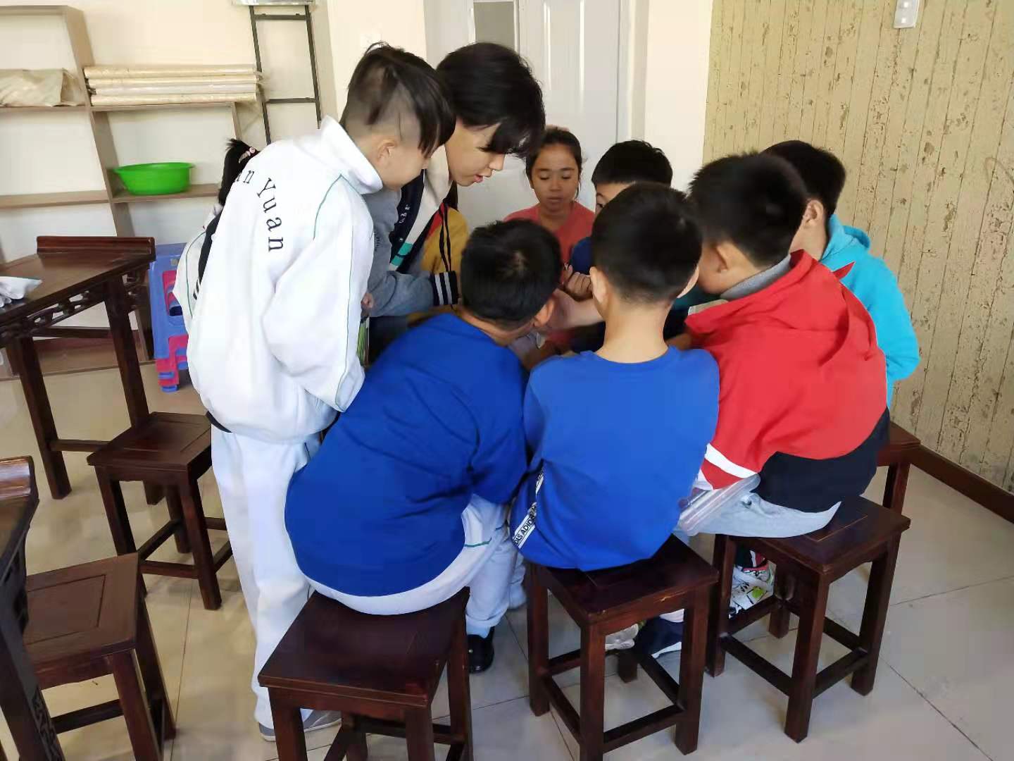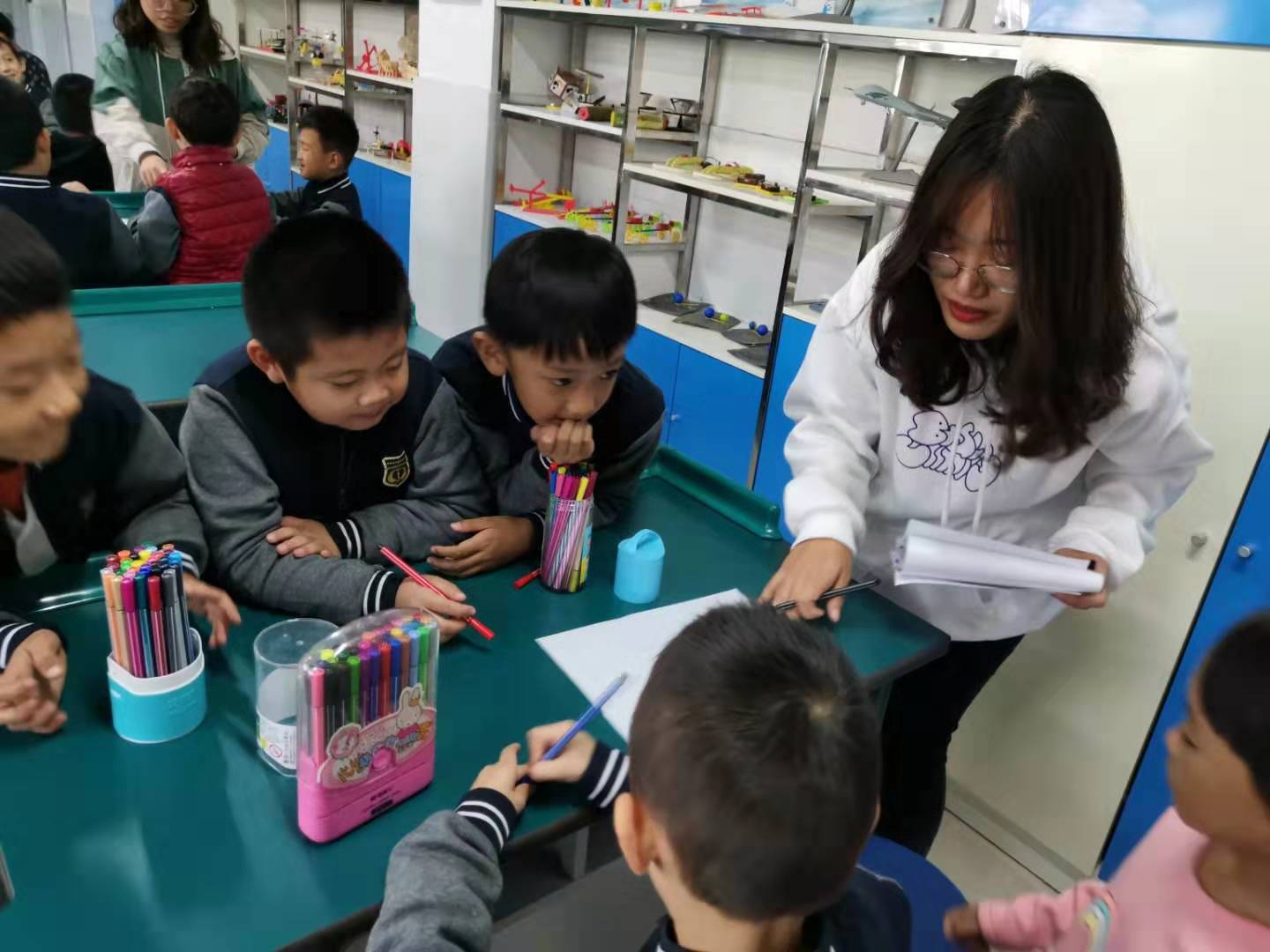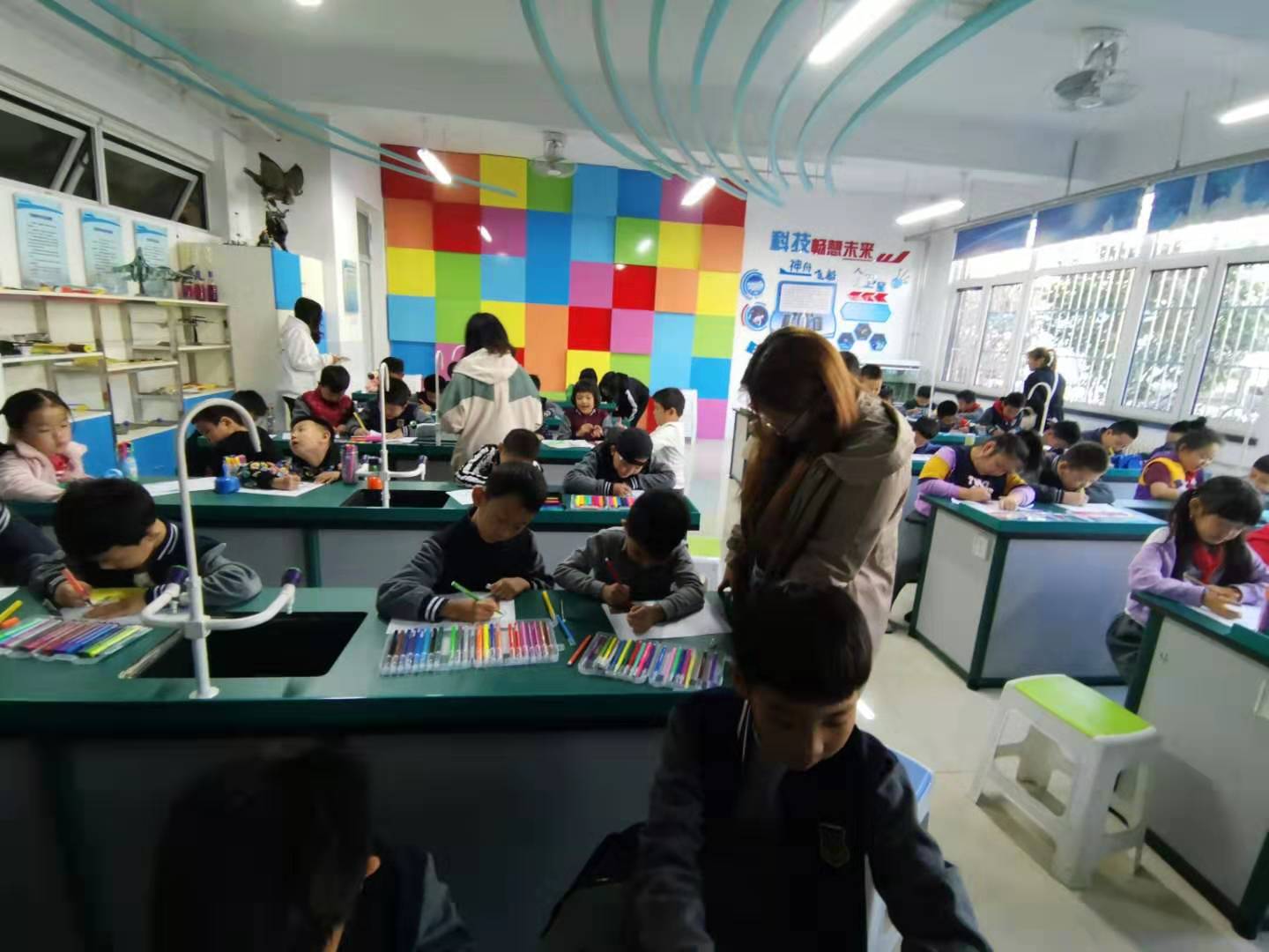 2019年10月14日下午两点,304永利集团登录入口老员工心理咨询中心的10名志愿者到达唐城壹零壹实验公司。在与公司心理咨询老师商定好具体事宜后,志愿者们开始带领唐城壹零壹实验公司的一年级至五年级的近百名员工进行团体心理绘画活动。