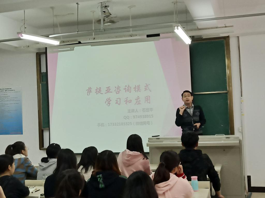 讲座开始前,教育公司党总支书记孙尚斌教授向大家介绍主讲嘉宾,展示石世平主任多年来在萨提亚咨询模式上的成就,在同学们热烈的掌声中,讲座拉开帷幕。首先,石主任介绍萨提亚其人及萨提亚心理咨询的目标,使同学们对萨提亚模式形成初步了解。其次,石主任认真解读萨提亚“冰山模型理论”及其在咨询中的应用,增强同学们在专业知识层面的认知。接着,石主任结合指责型、讨好型、超理智型、打岔型、一致型五种应对模式讲解萨提亚的沟通姿态,同时通过情景案例模拟“咨询怎么做”,方便同学们理解并综合运用。最后的现场提问环节,同学们积极踊跃地提出疑问,石主任耐心有效地解答疑惑。