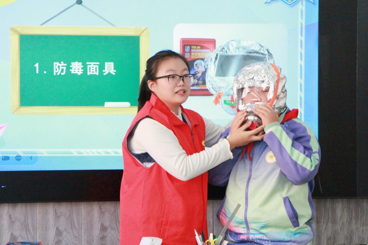 在路北区唐城壹零壹实验小学,宣讲团成员指导员工如何正确使用防毒面具