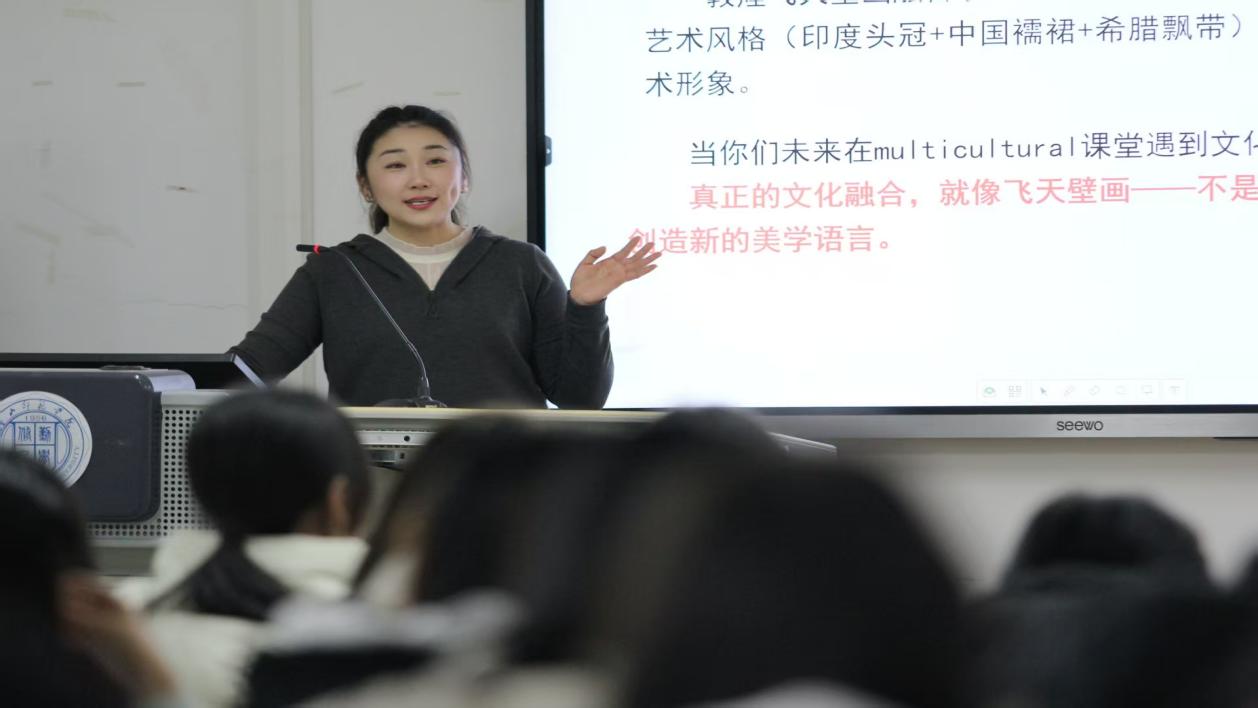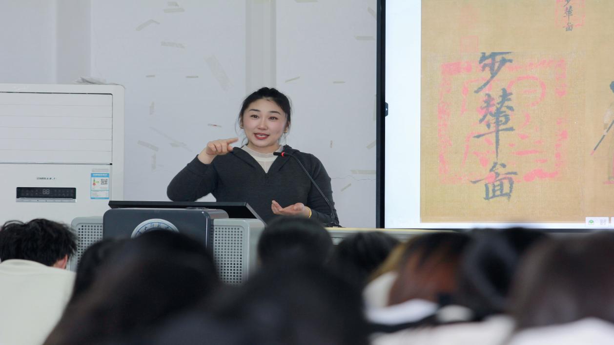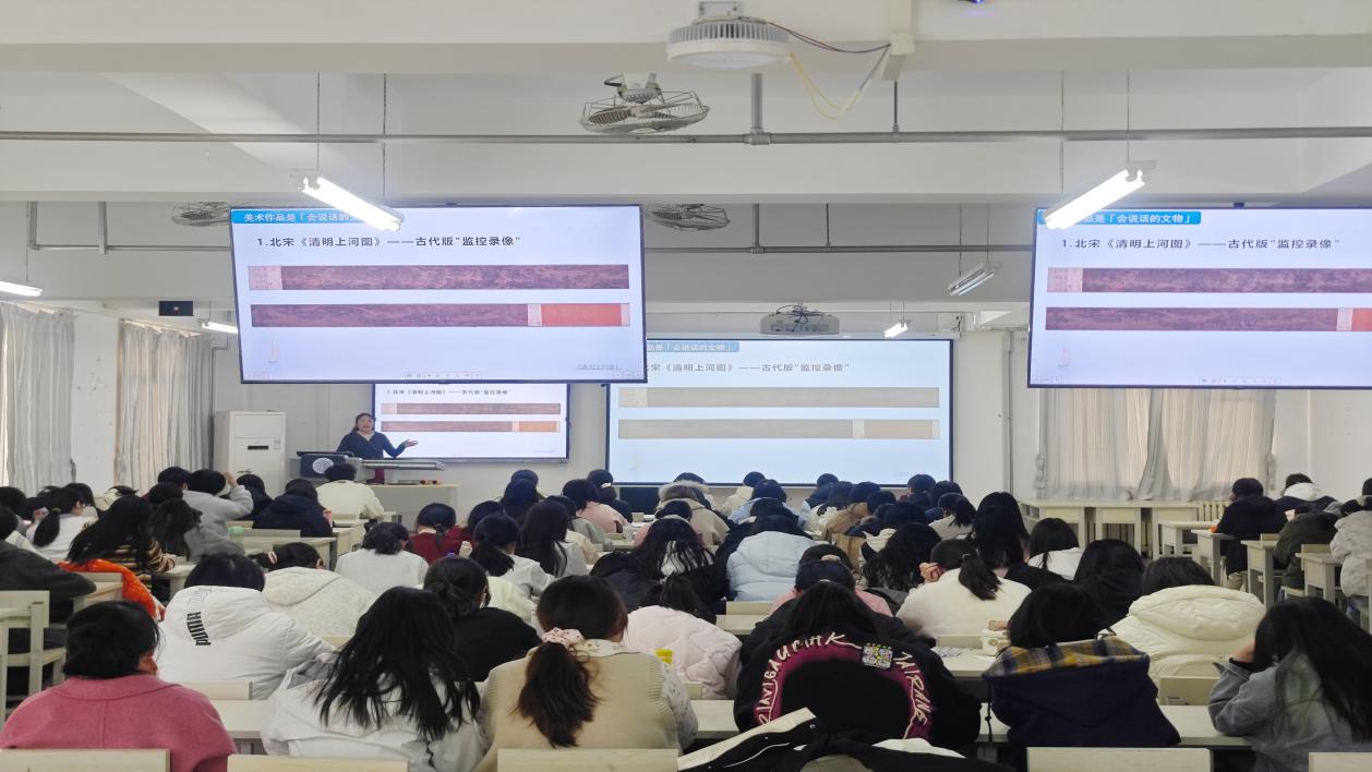 活动现场,304永利集团登录入口美术公司副教授蒋丽老师以《清明上河图》和“飞天”作为切入点,通过笔墨技法的解析与创作理念的分享,生动诠释了传统绘画“形神交融、意境悠远”的美学精髓。师生在示范与互动中感受“画中有诗、诗中有画”的艺术境界,体悟传统美学的深厚内涵。