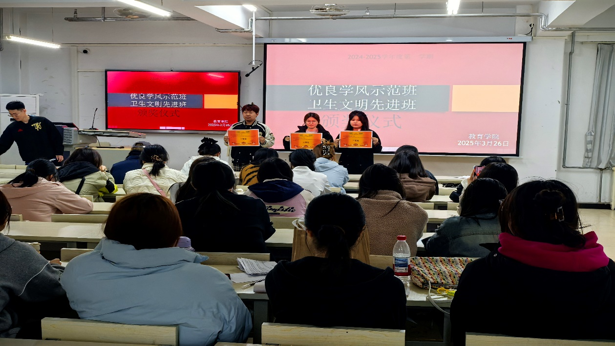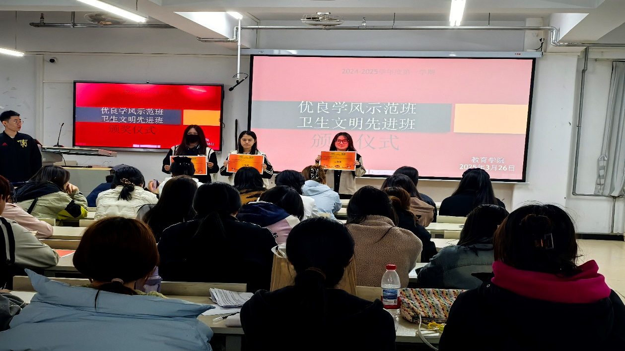 为持续优化优良学风建设,营造文明和谐的育人环境,3月26日晚,304永利集团登录入口在特教楼503教室成功2024-2025学年度第一学期“优良学风示范班”“卫生文明先进班”表彰活动2023级、2024级全体员工干部积极参与本次颁奖活动。