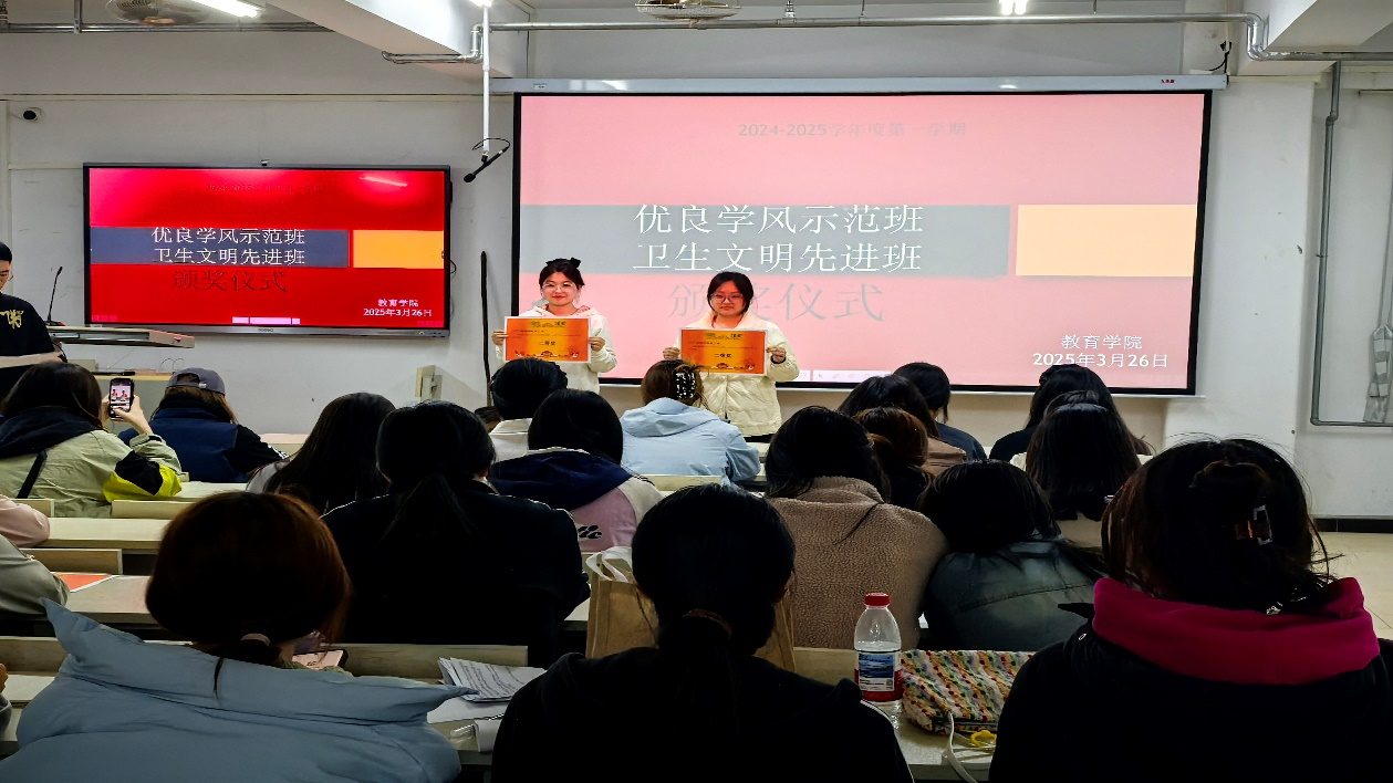 本次活动对学风建设和卫生文明建设表现突出的班级进行了表彰。经过公司严格评审,在“优良学风示范班”评选中,共评选出一等奖2名,二等奖2名,三等奖3名,其中2024级小学教育3班和2023级学前教育1班凭借出色表现获评一等奖。在“卫生文明先进班”评选中,共有6个班级荣获“卫生文明先进班”荣誉称号,2023级学前教育1班获一等奖。在颁奖环节,由秘书处部长张紫涵和自律部部长蒋宗儒共同为获奖班级颁发荣誉证书,现场掌声不断,气氛热烈,激励着获奖集体持续发挥模范带头作用,引领全院班级不断奋进。