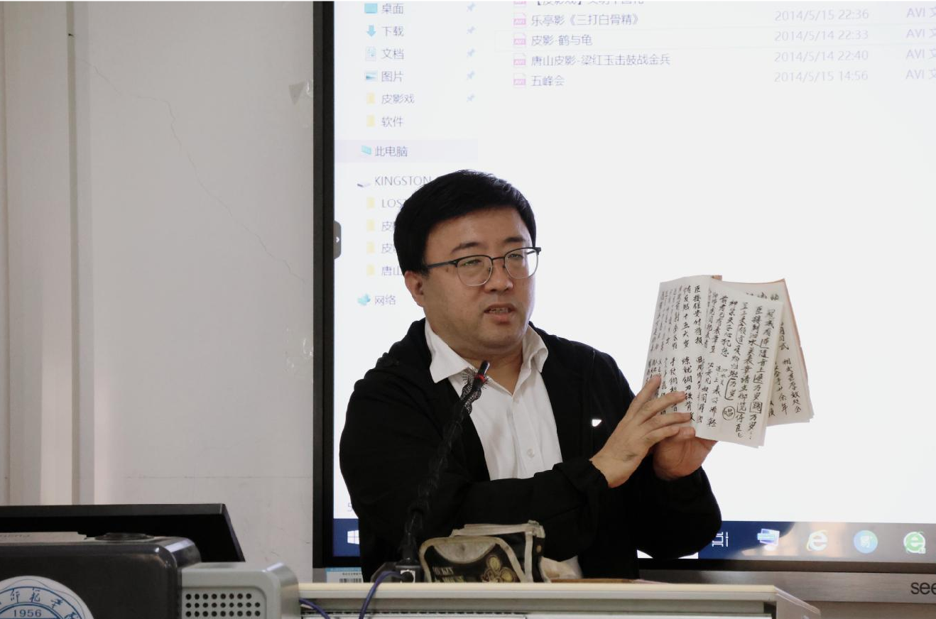 唐山皮影初创于明代末期,迄今已有四百多年历史。其造型精巧、色彩绚丽,在艺人操控下借助灯光投射于白幕,演绎古今故事,被誉为“指尖上的艺术”。活动中,周学军先生从皮影戏的定义、历史渊源、制作工艺、影卷结构及表演特点等方面,系统阐释了唐山皮影的艺术特色与文化内涵。