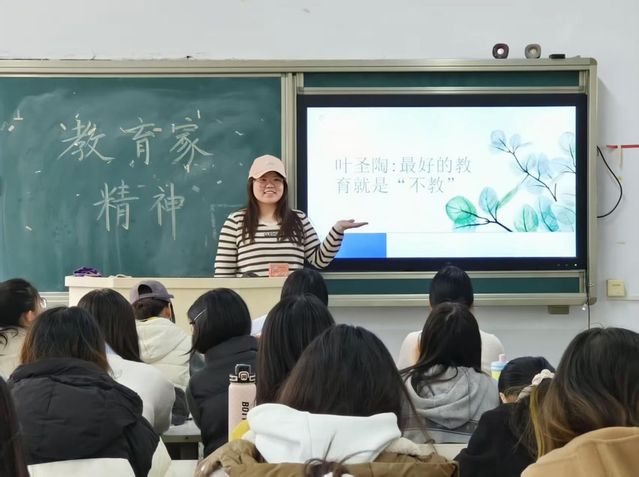 班会氛围升温阶段,杨懿丁配乐朗诵《师道长歌》,以深情演绎诠释教育家精神。此后,王奇玮、马晓玉分别分享苏格拉底与叶圣陶的教育故事:王奇玮详解“产婆术”启发式教学,并结合小学课堂实例说明实践方法;马晓玉围绕叶圣陶“生活即教育”“教是为了不教”理念,强调小学教育需贴近员工生活,主持人同步引导同学们结合专业展开讨论。
