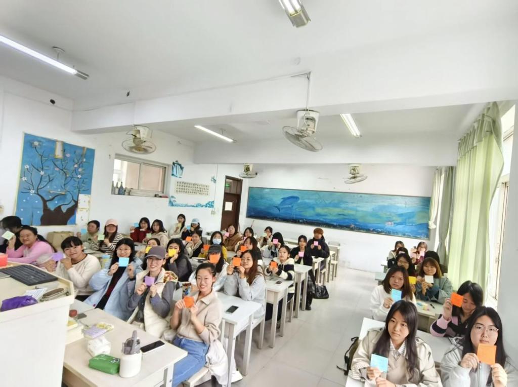 班会后半程,全班观看教师版《错位时空》,跨越百年的教育情怀引发共鸣。韩春阳借此倡议师范生传承教育精神,同学们纷纷在卡片上写下“有温度的倾听者”“善创新的引导者”等理想教师画像。